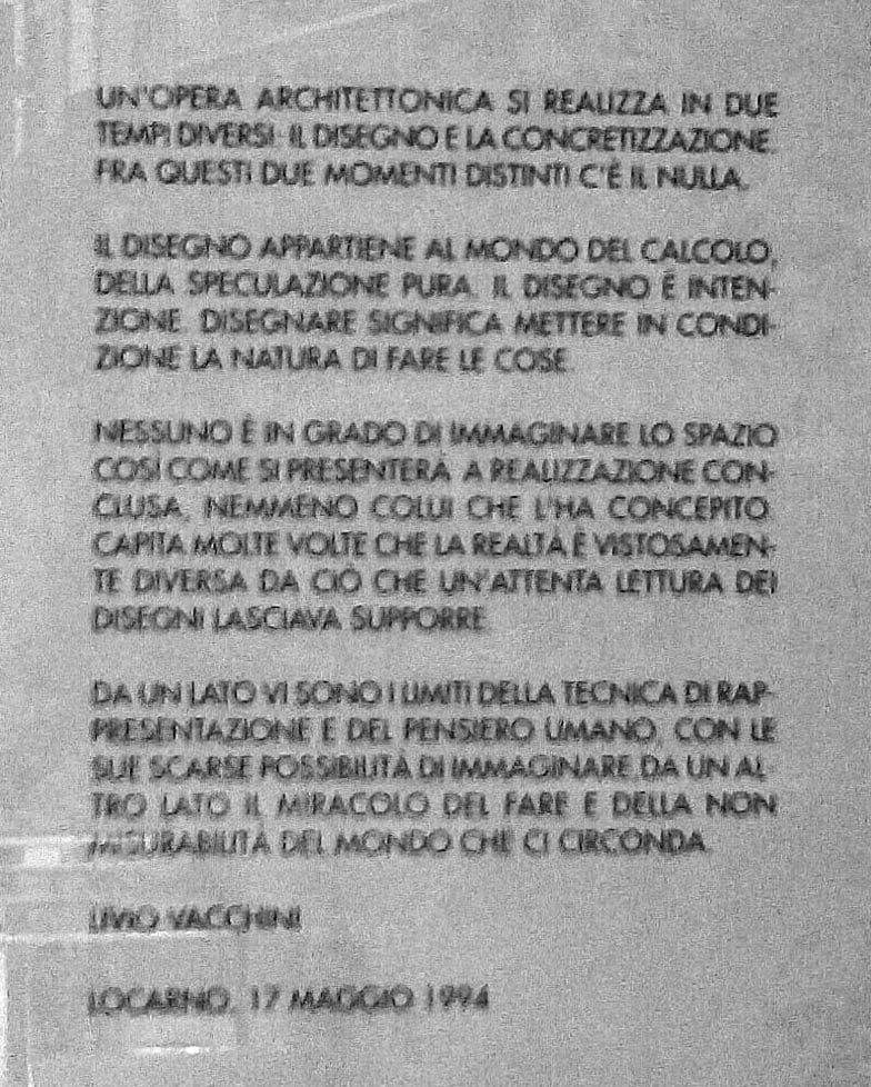 Colgados en una de las paredes del que fue su estudio, podemos encontrar enmarcados dos dibujos y el breve texto escrito en italiano (todo en mayúsculas) que se reproduce abajo. Este breve escrito recoge algunas de las reflexiones sobres las que Livio Vacchini volvía una y otra vez, y que solía expresar a modo de aforismos. En concreto recoge la relación entre dibujo, pensamiento y realidad construida. Y no es casual que esté acompañado por dos de los dibujos sintéticos que tanto le gustaban[1].