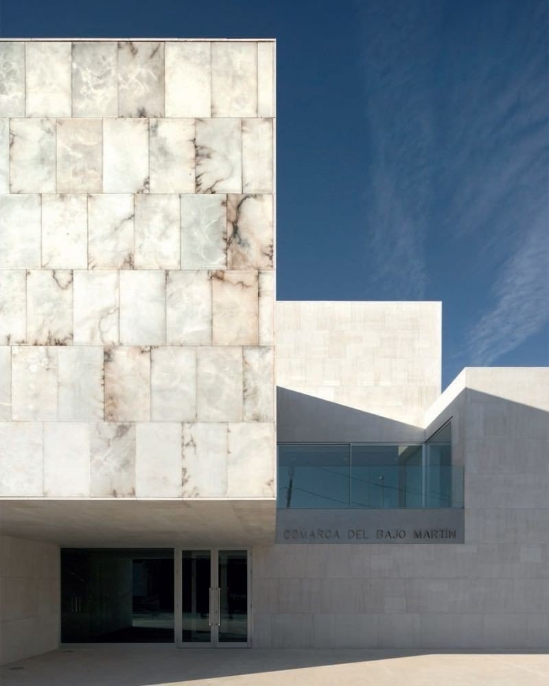 La ausencia de cualidades urbanas en el entorno legitima una cierta condición autónoma del edificio, que emerge del solar conformando una solución unitaria, clara y compacta. Por tanto, la necesaria vinculación del edificio con el lugar, reforzada por su carácter institucional, no se articula a partir de relaciones urbanas con el entorno inmediato, sino de referencias al paisaje geográfico, histórico y cultural, presentes en su configuración exterior. La macla de volúmenes tallados en materiales locales –piedra y alabastro-, hace alusión, de un modo abstracto y geométrico, a las agrupaciones pétreas azarosas que se producen en las canteras a cielo abierto de la zona.